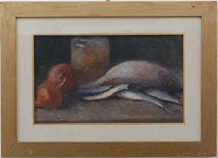 Ignoto "Composizione con pesci" olio su compensato (cm 26x44) In cornice