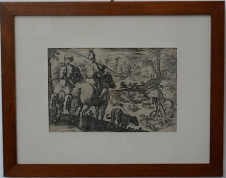 Antonio Tempesta "Caccia allo struzzo" bulino (mm 183x275 circa). In passepartou