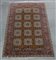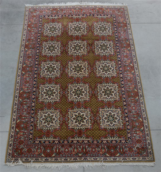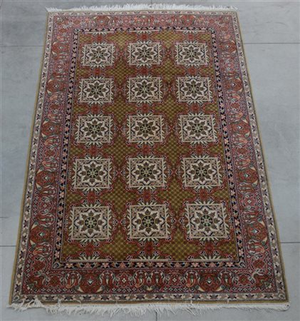 Decoro geometrico con file di quadrati a fondo bianco decorato con motivi floreali su fondo mattone e senape. (cm 312x200) (lievi difetti)