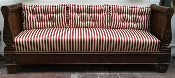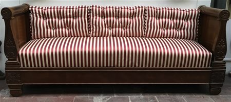Coppia di divani da parete in mogano, montanti sagomati e intagliati a motivi vegetali (l cm 195) (difetti)