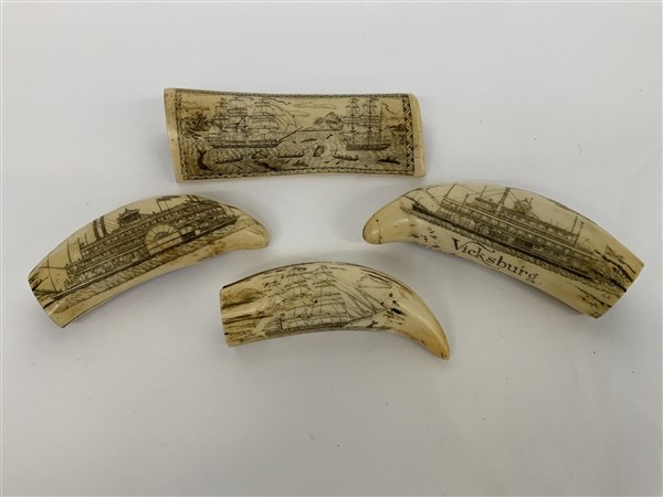 Lotto di quattro elementi decorativi a forma di denti e ossa di balena in resina sintetica incisi a imbarcazioni e iscrizioni inglesi (difetti)