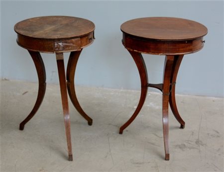 Coppia di tavolini tondi tripodi con cassetto nella fascia e gambe a sciabola (d cm 39 x h 56) (difetti e mancanze)