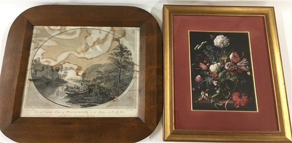 Lotto composto da un incisione del sec. XVIII da Pynacker's ed una riproduzione raffigurante fiori, in cornici (gravi difetti)