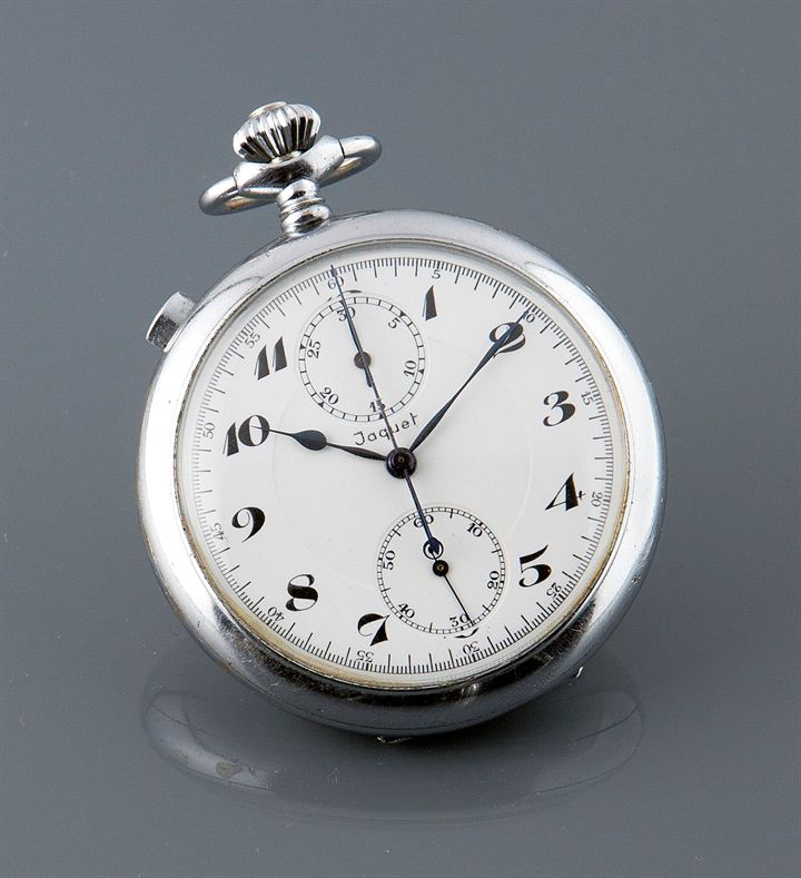 Orologio da tasca, cronografo rattrappante, due contatori firmato "Jaque", metà XX secolo