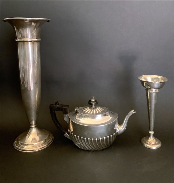 Lotto composto da una teiera e due vasi portafiori in argento (g lordi 770 circa) (difetti)