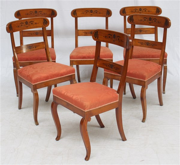 Gruppo di sei sedie con schienale a giorno decorato a volute fogliate, gambe anteriori mosse. Secolo XIX (difetti)
