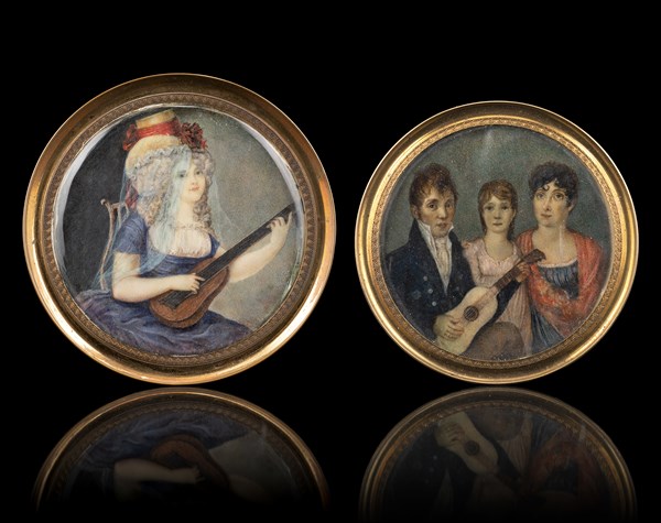 Due miniature di forma circolare raffiguranti musicanti in cornici dorate. Seco