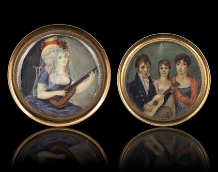 Due miniature di forma circolare raffiguranti musicanti in cornici dorate. Secolo XIX (d. max cm 7,3) In cornici (difetti)