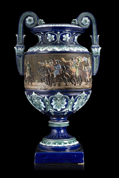 Manifattura francese o inglese, secolo XIX.Vaso biansato in ceramica di forma classica. Fascia centrale decorata in policromia con corteo di figure di regnanti e dignitari a cavallo. Corpo smaltato nei toni del blu e decorato in rilievo a foglie d'acanto e motivi stilizzati. Marca e numerale 8966 incusso alla base (h. cm 50) (lievi difetti)