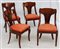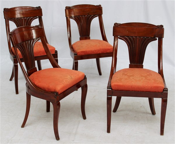 Gruppo di quattro sedie a gondola in noce con schienale a cartella intagliata, gambe anteriori mosse e posteriori a sciabola. Secolo XIX (difetti)