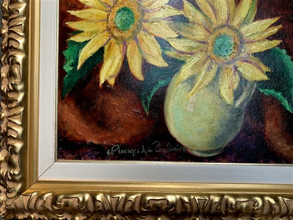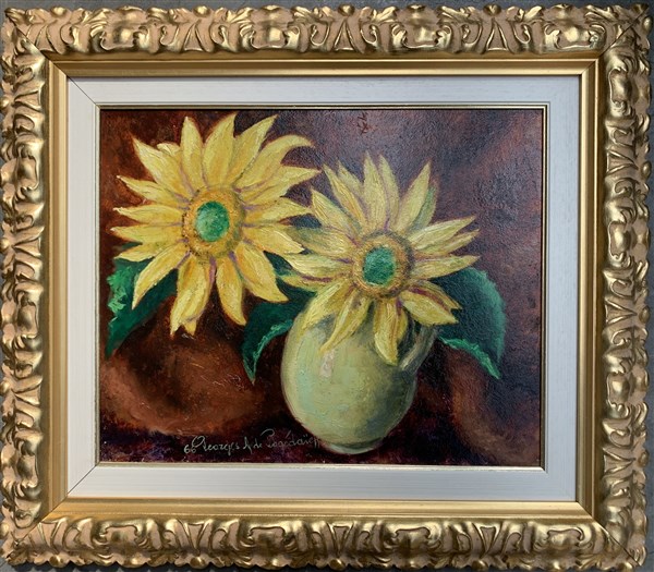 Georges De Pogedaieff Anatolevich "Due girasoli" 1966 olio su faesite (cm 33x42)