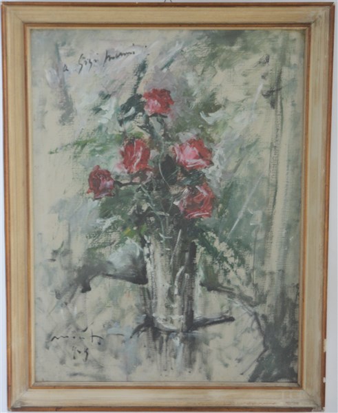 "Vaso di rose" olio su tela (cm 84x63) Firmato e datato in basso a sinistra; dedicato in alto a sinistra. In cornice