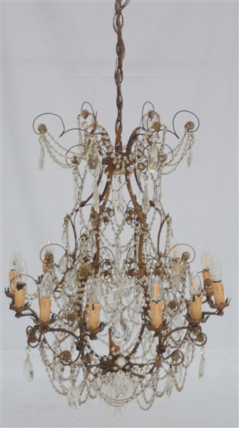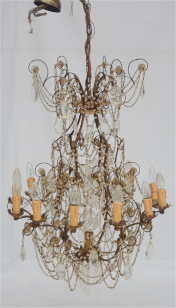 Coppia di lampadari in metallo dorato a tredici luci con pendenti (h cm 90)