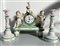 ANONIMO. Trittico porcellana formato da una pendola decorata da due figure di putti a tuttotondo e da due candelieri analoghi. Epoca della cassa XIX Secolo, movimento e quadrante posteriori. Movimento ad un solo treno con scappamento a bilanciere. Quadrante in smalto bianco a numeri romani. (difetti, sostituzioni)