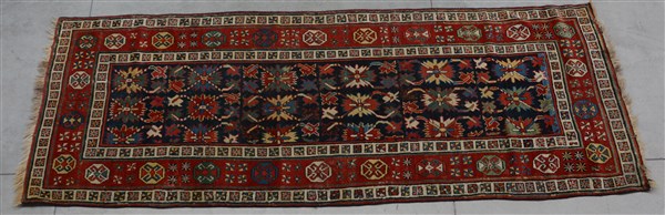 Decoro con piccoli medaglioni raffiguranti granchi stilizzati, policromi su fondo blu. Bordura a fondo rosso. (cm 266x99) (Difetti, vecchi restauri, rapature)