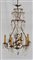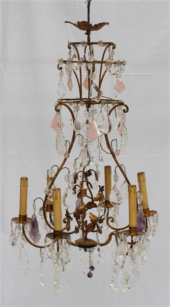 Lampadario a sei luci con struttura in metallo dorato, con pendenti a fiori e foglie, bracci sagomati, pendagli in vetro, pietre dure e cristallo di rocca (h cm 90) (difetti)