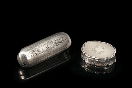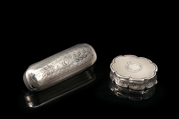 Vinaigrette in argento di forma ovale sagomata con superficie incisa a girali fogliati e guillochè, interno in vermeil con coperchio traforato ed inciso. Birmingham 1848, argentiere Edward Smith (cm 3,3x2,7ca) (gr 16 ca.) unito ad un portabocchino in argento con incisioni stilizzate e monogramma 'AC'. Birmingham 1809, argentiere Joseph Willmare (cm 6,5) (lievi difetti)