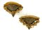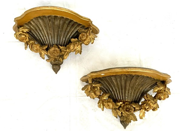 Coppia di mensole in legno intagliato, dorato e argentato a ghiarlande di fiori