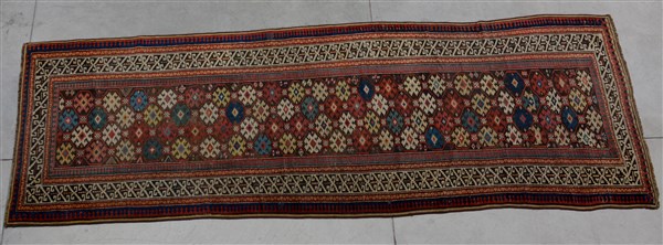 Decoro all-over con piccoli medaglioni ottagonali policromi su fondo marrone scuro. Bordura con nuvole a S su fondo bianco. (cm 285x101) (Difetti, rapature, vecchi restauri)