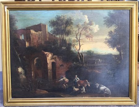 Scuola della fine del secolo XVIII "Paesaggio con pastori e armenti" olio su te