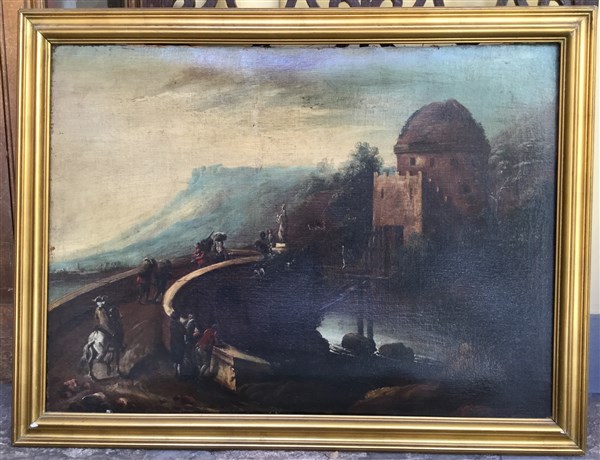 Scuola della fine del secolo XVIII "Paesaggio con figure presso un ponte" olio