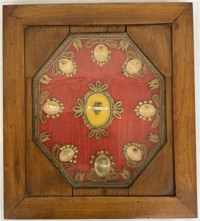 Reliquiario in teca contenete nove reliquie con supporti decorati a motivi floreali in carta dorata e strass colorati. Secolo XVIII (cm 43,5x49) (difetti)