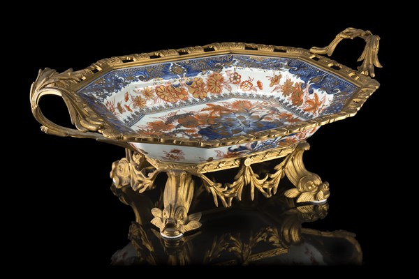 Alzata biansata in metallo e porcellana Imari decorata in policromia a motivi f