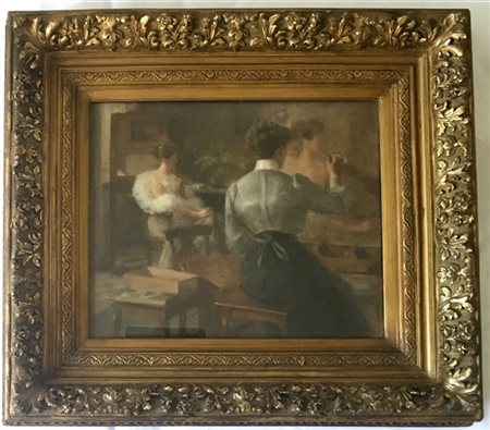 Maestro del XIX Secolo "La pittrice" olio su tela (cm 38x46) Al retro: cartigli