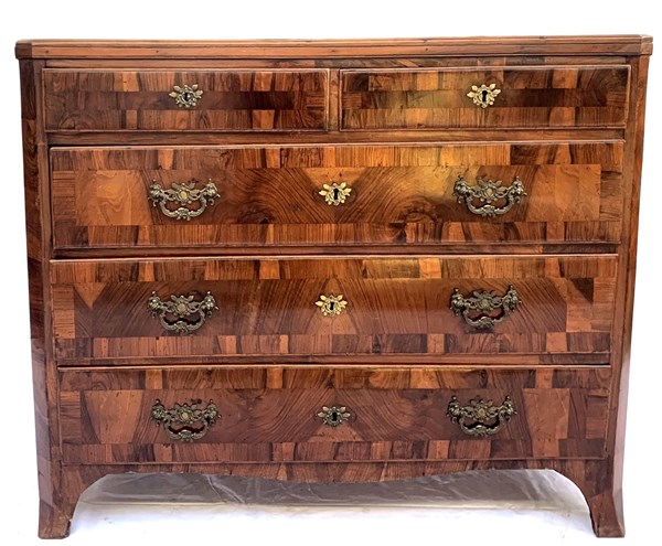Comò lastronato in radica di noce e mogano con fronte a tre cassetti grandi e due piccoli, angoli smussati e maniglia in metallo dorato. Secolo XVIII (cm 120x100x59) (difetti e restauri)