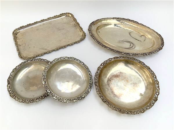 Lotto di cinque vassoi in argento di con tese traforate (g 2300) (difetti)
