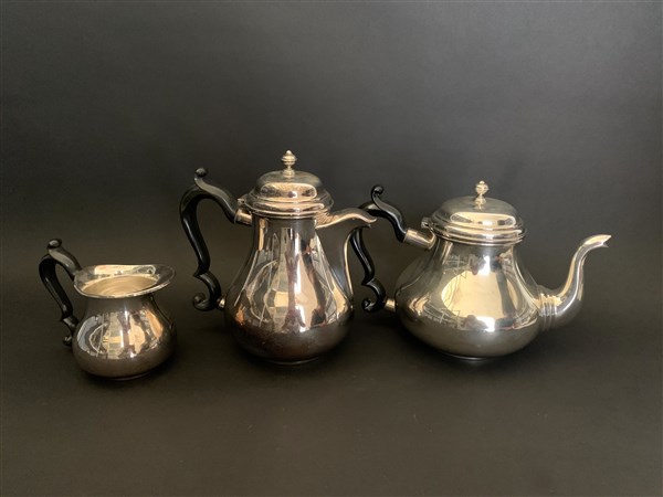 A silver tea and coffe set composed of: a teapot, a coffepot and a milk jug. Titled 800 (g 1300 ca)