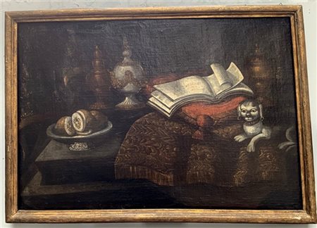 Ignoto "Natura morta con cane, limoni, spartito musicale e vasi" antico dipinto