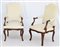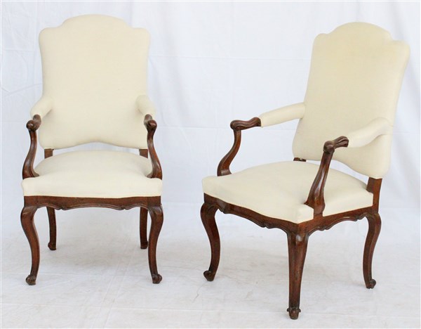Coppia di poltrone in noce con schienale, braccioli e gambe di forma mossa, rivestite in tessuto bianco, secolo XVIII(difetti e restauri)