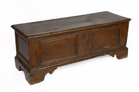 Antica cassapanca con fronte bipartito e riquadrato, piedi a mensola (cm 133x51x47) (difetti e restauri)