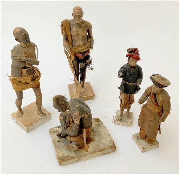Gruppo di cinque figure modellate in terracotta con abiti in tessuto (gravi difetti e mancanze)