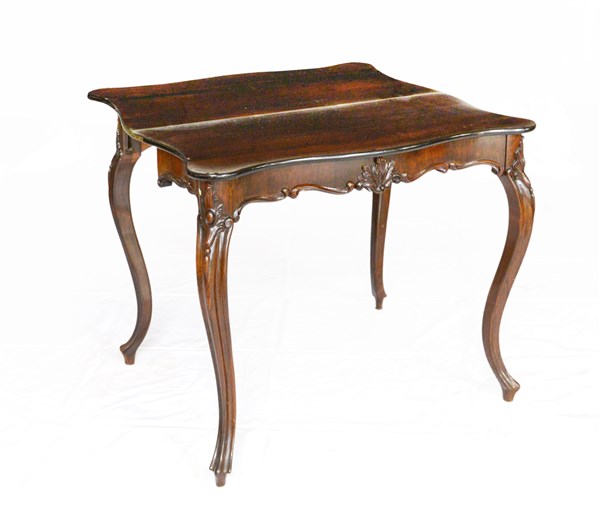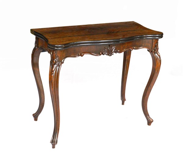 Tavolino da gioco di forma sagomata con piano a libro in palissandro filettato, quattro gambe e fascia intagliate a motivi vegetali e volute (cm 88x77x43) (difetti)