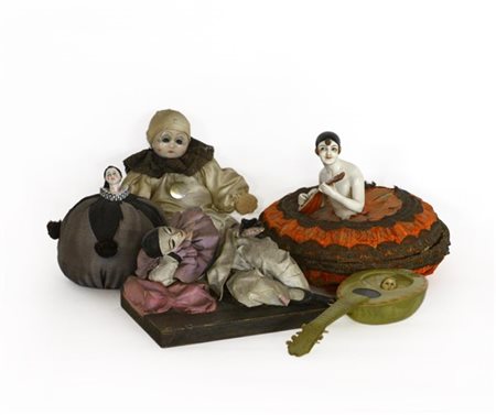 Lotto composto da cinque oggetti diversi in porcellana, stoffa, legno e plastica inerenti Pierrot. Secolo XX. (h max cm 20) (difetti)