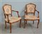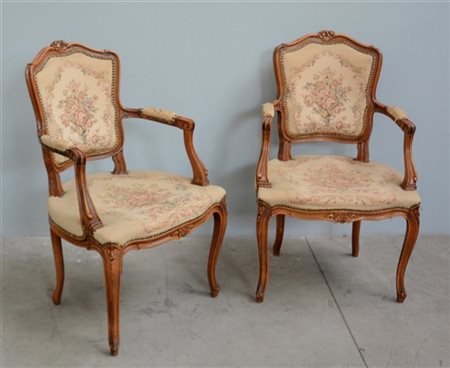 Coppia di poltroncine in legno intagliato di forma mossa rivestite in tessuto operato (difetti)