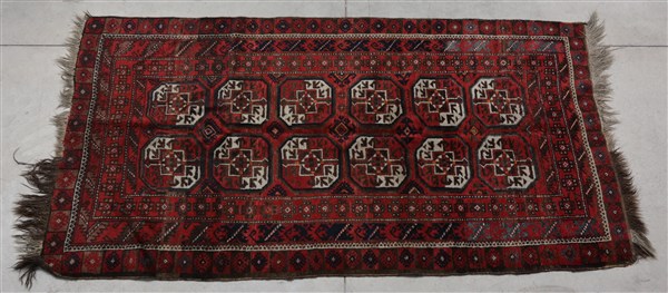 Tappeto Afghan, secolo XX. Decoro con due file di Gul su fondo rosso. (cm 216x1
