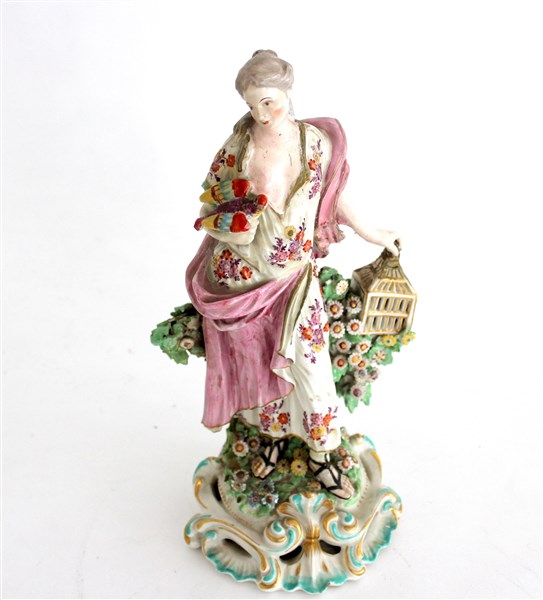 Figura un cermaica dipinta in policromia raffigurante dama con pappagallo e gabbia (h cm 24) (difetti e restauri)