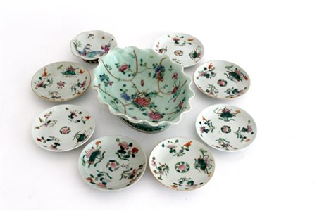 Lotto composto da un centrotavola Canton a fondo celadon con decori floreali, un'alzatina e sette piattini