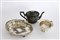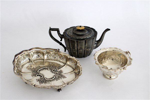 Lotto composto da una teiera inglese in metallo inciso e due cestini in metallo argentato e sbalzato (lievi difetti)