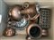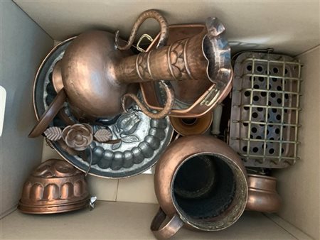 Cartone contenente numerosi oggetti in rame fra cui due forme per budino e una