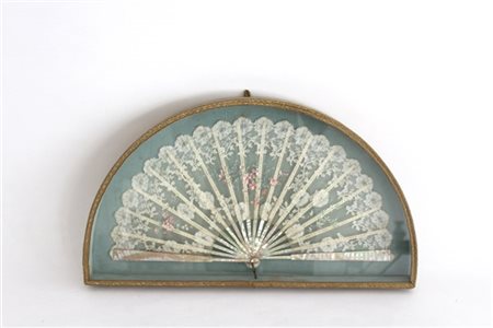 Ventaglio con pagina in pizzo a motivi floreali e stecche in madreperla, in teca (lievi difetti)