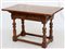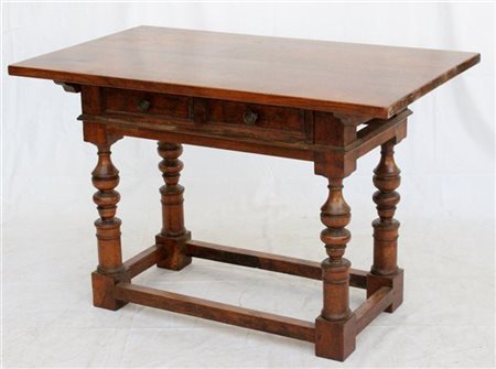 Tavolino in noce con cassetto sottopiano, gambe tornite a rocchetto e traverse dritte (cm 120x78x70) (difetti)