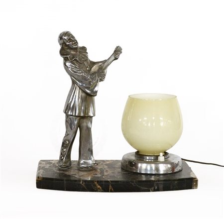 Lampada da tavolo decorata con scultura tuttotondo di Pierrot in metallo argentato, paralume in vetro incamiciato lattimo, base in marmo nero venato. Secolo XX. (h cm 28) (gravi difetti)