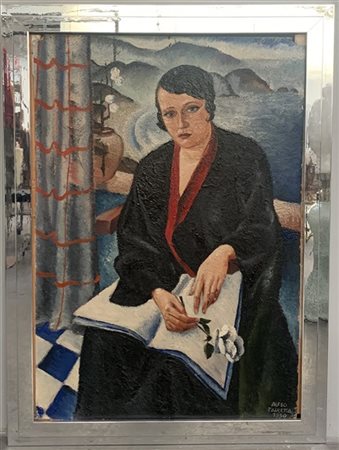 "Ritratto femminile con rosa" olio su compensato (cm 98x67) Firmato e datato 1930 in basso a destra. In cornice (difetti)