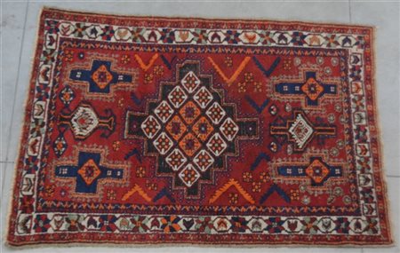 Tappeto Hamadan, Persia, secolo XX. Decoro geometrico policromo su fondo rosso.