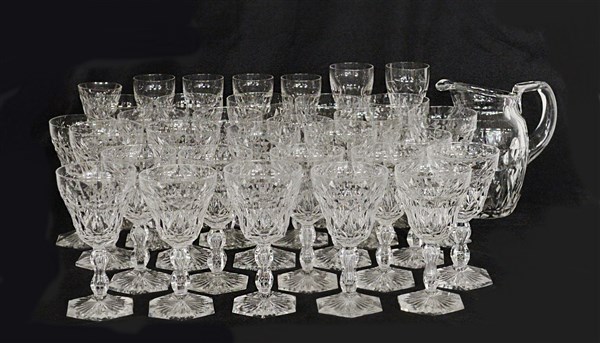 Lotto composto da sedici bicchieri in cristallo molato marcati Val St Lambert o siglati V.L. uniti ad altri diciassette bicchieri ed una brocca di in cristallo di uguale decoro (difetti)