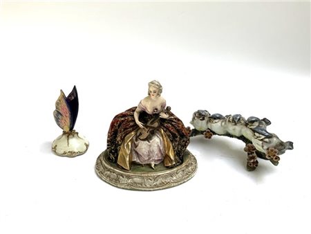 Lotto composto da un gruppo scultoreo in porcellana policroma raffiguranti cinque passerotti, firmato sotto la base, una scultura a tutto tondo in porcellana policroma raffigurante una damina in abiti settecenteschi firmato sotto la base, unito a una sculturina in porcellana policroma raffigurante una farfalla. Secolo XX. (h max cm 16) (lievi difetti)